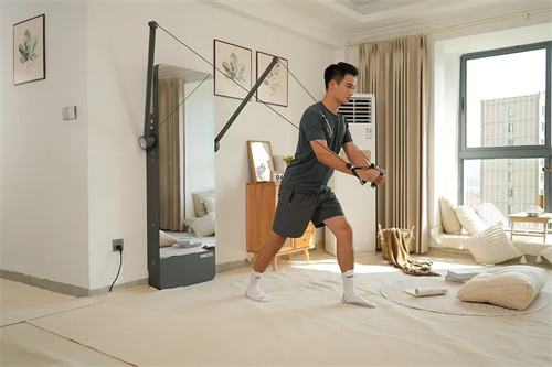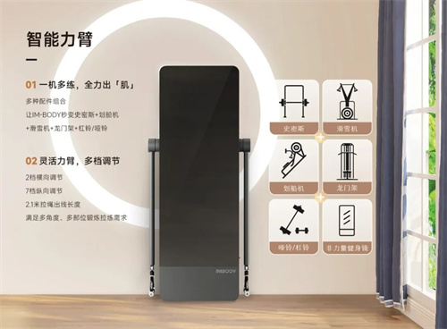 產品配置了一對智能力臂,用戶訓練時,AI算法可實時反饋訓練者的動作力量,并通過對每一個動作的專項測試,分析出適合健身者的最佳重量。智能力臂能模擬健身房擼鐵動作,輔助健身者完成各種力量訓練。