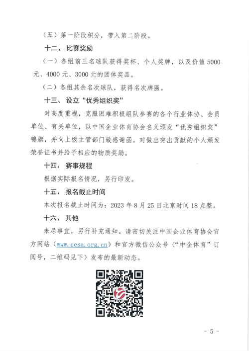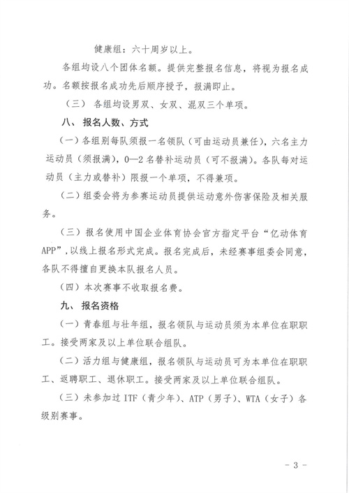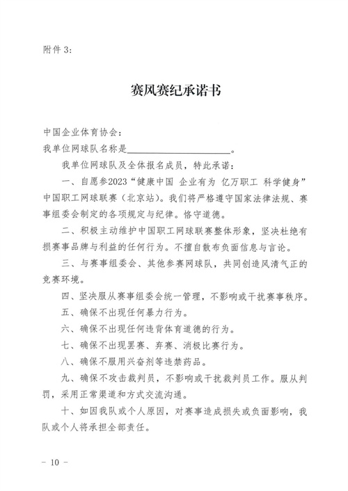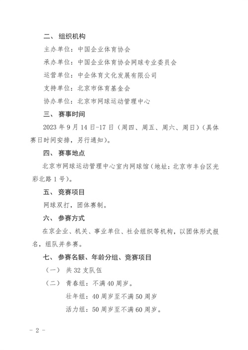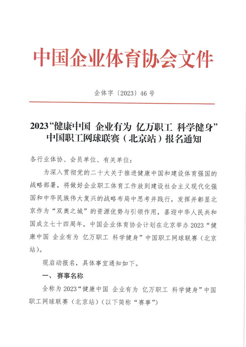 為喜迎中華人民共和國成立七十四周年,中國企業體育協會計劃在北京,舉辦2023“健康中國 企業有為 億萬職工 科學健身”中國職工網球聯賽(北京站)比賽,現啟動報名工作。點擊此處下載PDF版報名通知全文。