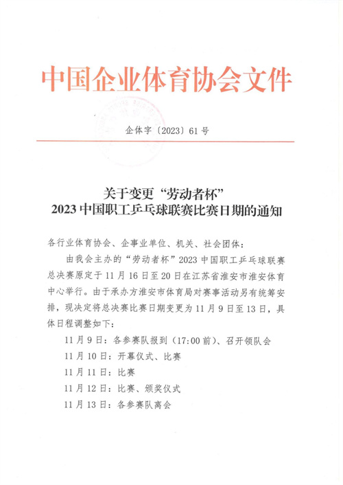 關(guān)于變更“勞動(dòng)者杯”2023中國(guó)職工乒乓球聯(lián)賽比賽日期的通知