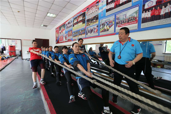 教練閆士安指導(dǎo)鞍鋼拔河隊(duì)進(jìn)行蹬地和協(xié)調(diào)性訓(xùn)練