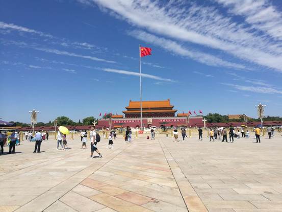 進(jìn)入廣場(chǎng)后,看見湛藍(lán)的天空,飄著帶狀的白云,把紅墻黃瓦的天安門城樓映的格處醒目。與4月30日那次空無一人的廣場(chǎng)相比,游人多了起來,游客們紛紛拿起手機(jī)、相機(jī)拍照。有的游人甚至躲在武警戰(zhàn)士站崗的遮陽(yáng)傘下拍攝留念,而站崗的戰(zhàn)士仍筆直站立著并沒有制止游客的行為。