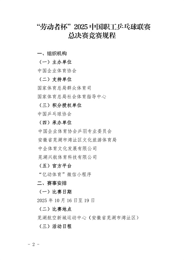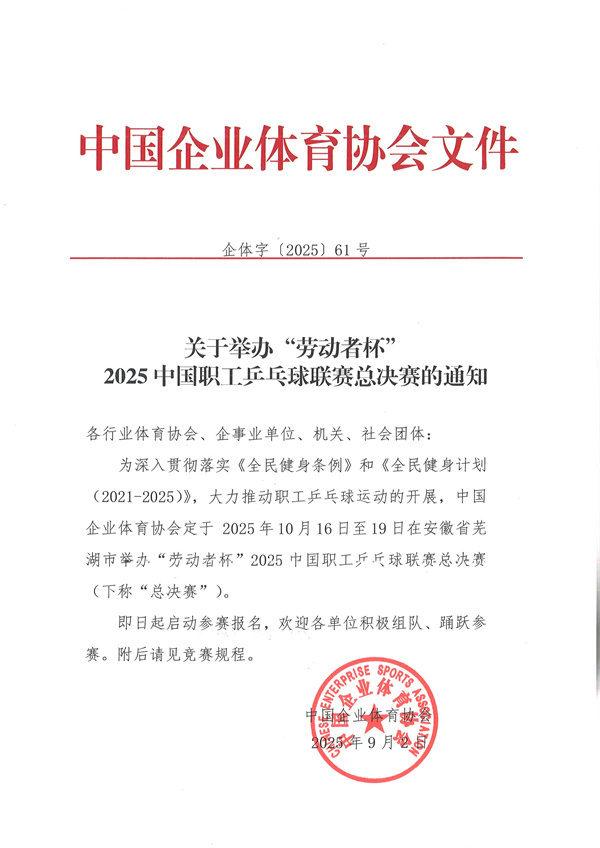 關于舉辦“勞動者杯”2025中國職工乒乓球聯賽總決賽的通知