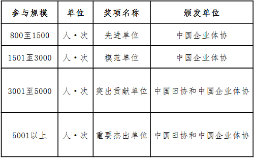 1.根據(jù)各單位賽區(qū)賽的參與規(guī)模,中國企業(yè)體協(xié)與中國田協(xié)為各單位頒發(fā)對應(yīng)的紀(jì)念牌匾。標(biāo)準(zhǔn)如下:
