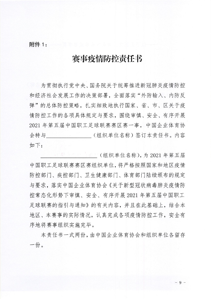 (九)精準防控,精細管理。我會將根據疫情防控形勢的變化,及時對上述要求,進行動態調整。各賽區賽組織單位應在本文件內容的基礎上,制定各自賽事的疫情防控工作方案和應急預案,并嚴格執行。各個賽事的參與各方,都應一直秉持“安全第一”的根本理念,在疫情防控進入常態化的實際情況下,各方共同努力,守好“人民群眾健康大門”的同時,繼續合力打造“中國職工足球聯賽”品牌與文化,在精準實施疫情防控工作的基礎上,不斷滿足廣大職工日益增長的美好生活需要。
