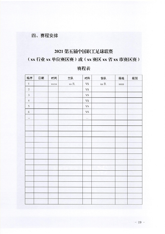 (二)賽區賽:是2021年中國職工足球聯賽的最基礎賽事,在各單位、各城市內開展。由組織單位根據我會提供的宏觀標準,結合本單位、本地區的實際情況,制定具體的實施方案,并負責組織實施。賽區賽分為行業、地理兩大類,劃分標準與原則保持不變。