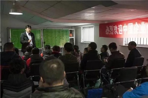 2017年,遲尚斌為中國職工足球聯賽航空工業(yè)沈飛賽區(qū)的隊員們講解戰(zhàn)術
