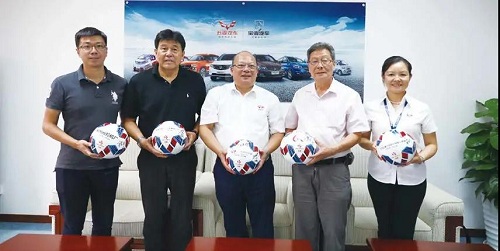 2018年,中國足球協會副主席容志行(右2)、中國企業(yè)體育協會職工足球委員會主席遲尚斌(左2),到訪上汽通用五菱,并贈送定制足球