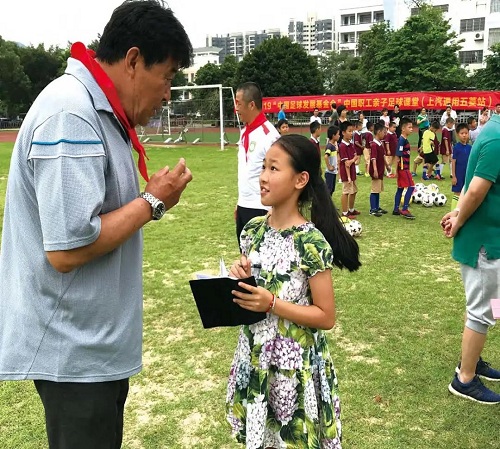 2019年,遲尚斌在參加中國企業(yè)體協與上汽通用五菱聯辦的職工子女足球課堂時,接受柳州27中及附小的小記者采訪