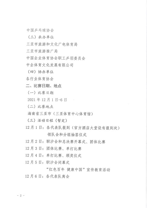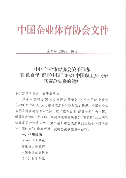 中國企業體育協會關于舉辦2021中國職工乒乓球聯賽總決賽通知