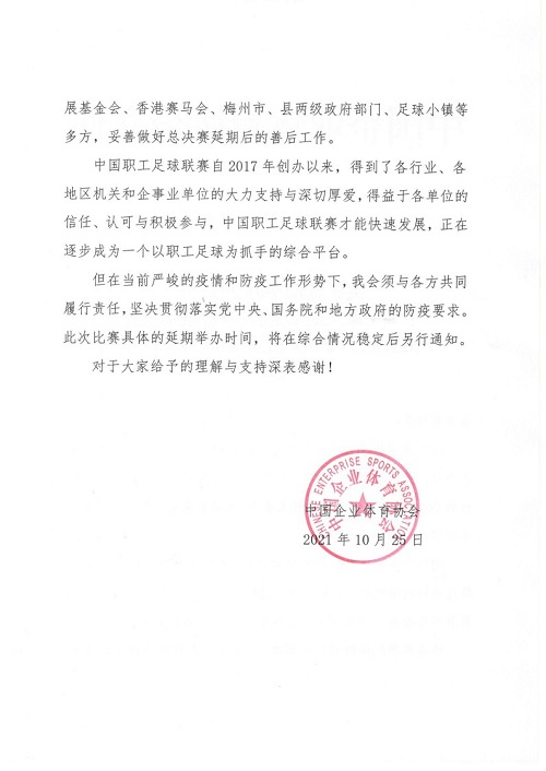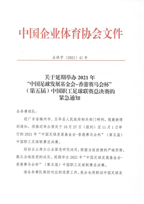 關(guān)于延期舉辦2021年“中國(guó)足球發(fā)展基金會(huì)-香港賽馬會(huì)杯”(第五屆)中國(guó)職工足球聯(lián)賽總決賽的緊急通知