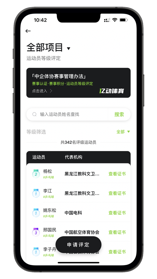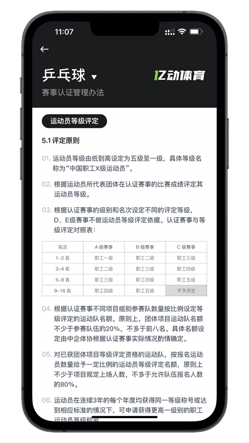 參加認證賽事的運動員,除了獲得積分外,取得優(yōu)異成績還可獲得運動員等級。運動員等級由高到低依次分為職工1級 - 職工5級。運動員等級一經(jīng)獲得,將作為永久榮譽,終身有效。