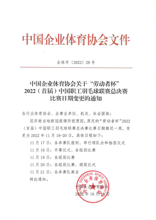 中國企業體育協會關于“勞動者杯”2022(首屆)中國職工羽毛球聯賽總決賽比賽日期變更的通知