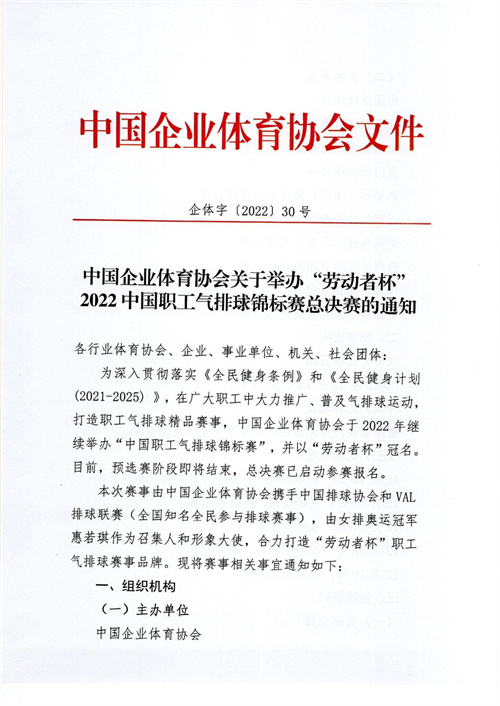 中國企業體育協會關于舉辦“勞動者杯”2022中國職工氣排球錦標賽總決賽的通知