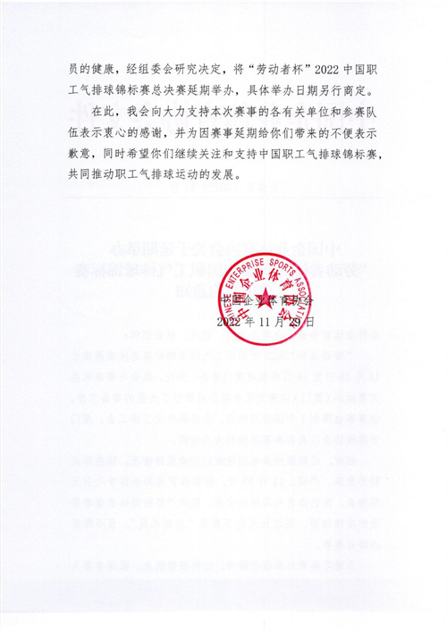 中國企業體育協會關于延期舉辦“勞動者杯”2022中國職工氣排球錦標賽總決賽的通知