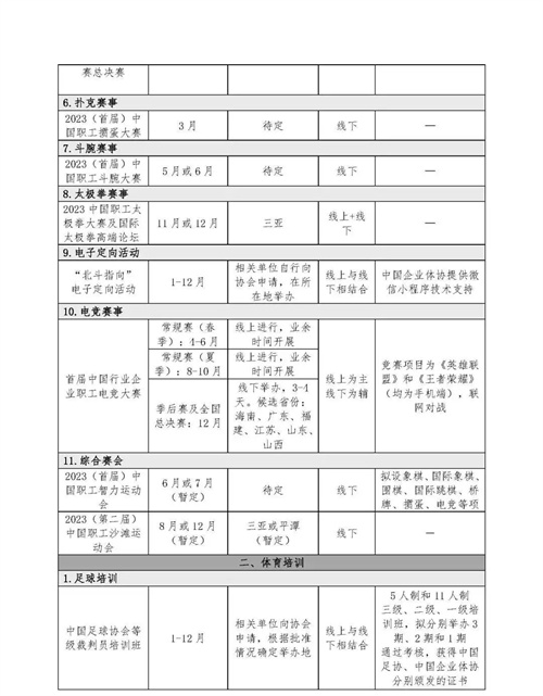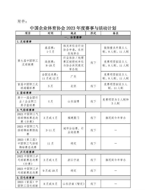 為全面深入貫徹落實新修訂后的《中華人民共和國體育法》、《關于構建更高水平的全民健身公共服務體系的意見》、《全民健身計劃(2021-2025年)》,不斷發揮體育運動的多重功效,助力《“健康中國2030”規劃綱要》不斷做實,現印發《中國企業體育協會2023年度賽事與活動計劃》。