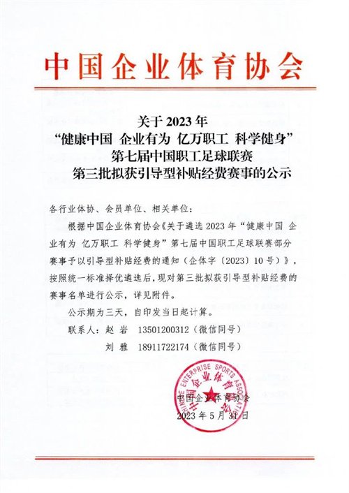 關于第七屆中國職工足球聯賽第三批擬獲引導型補貼經費賽事的公示