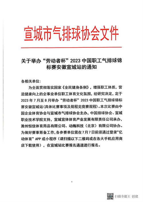 關(guān)于舉辦“勞動者杯”2023中國職工氣排球錦標(biāo)賽安徽宣城站的通知