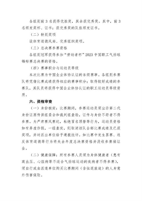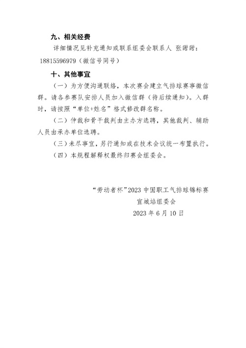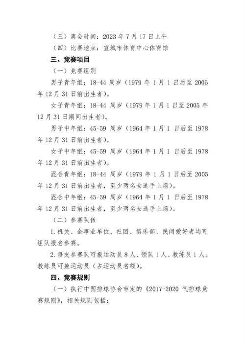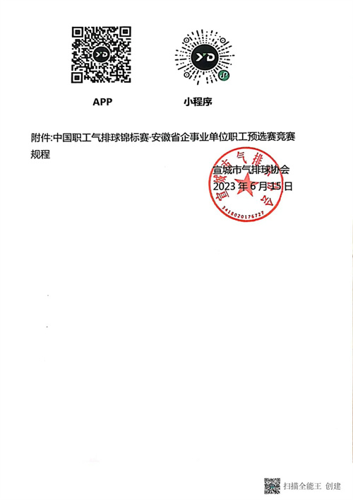 為促進(jìn)職工氣排球運動的開展,推動全民健身運動和健康中國建設(shè),我會將繼續(xù)舉辦“勞動者杯”2023中國職工氣排球錦標(biāo)賽(以下簡稱“錦標(biāo)賽”),并延續(xù)“預(yù)選賽+總決賽”的組織形式。經(jīng)研究決定,錦標(biāo)賽安徽宣城站預(yù)選賽將于2023年7月15日-16日舉行,現(xiàn)已啟動報名工作,望各行業(yè)體育協(xié)會、企事業(yè)單位、社會團體積極組隊、踴躍參加。(附后請見競賽規(guī)程)