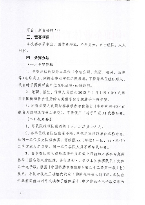 2、兼職、派駐、借調人員以及2018年1月1日(含)之后在中國橋牌協會注冊的A類俱樂部專職牌手不得參賽。
