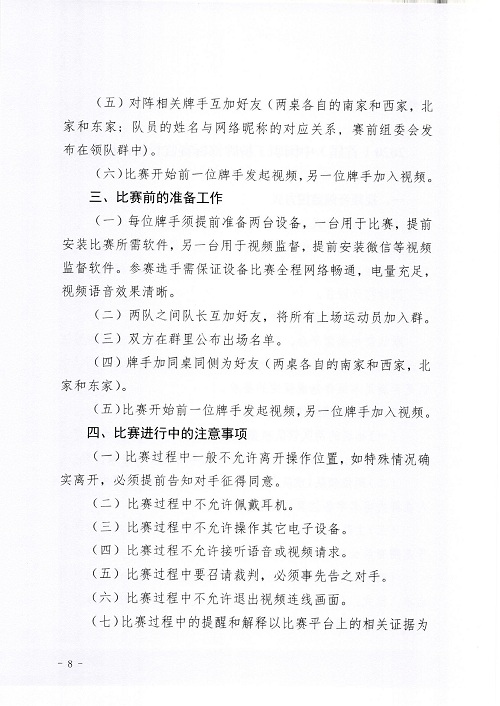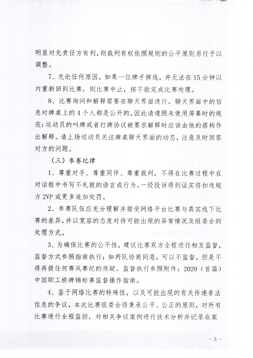 3、為確保比賽的公平性,建議比賽雙方全程進行相互監督,監督方式參照指南執行;如兩隊協商同意,可以不監督,但是不得再提任何賽風賽紀的質疑。監督執行參照附件:全國職工健康促進工程?健康運動2020(首屆)中國職工橋牌錦標賽監督操作指南。