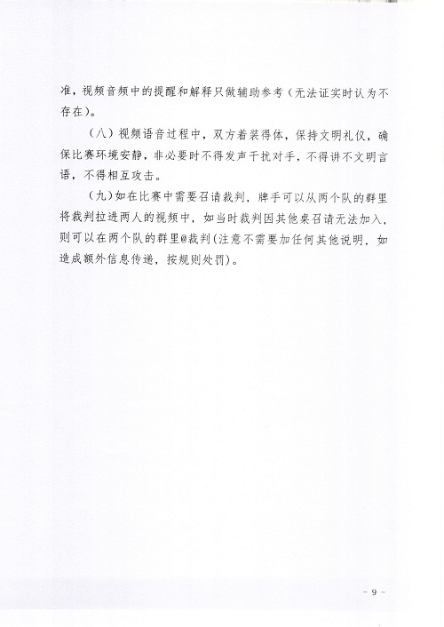 4、如有叫牌和打牌方面的爭議,請及時召請裁判。如裁判不能及時到場,請場上隊員及時通過截圖或錄像方式將叫牌和打牌過程以及相關文字證據保留。