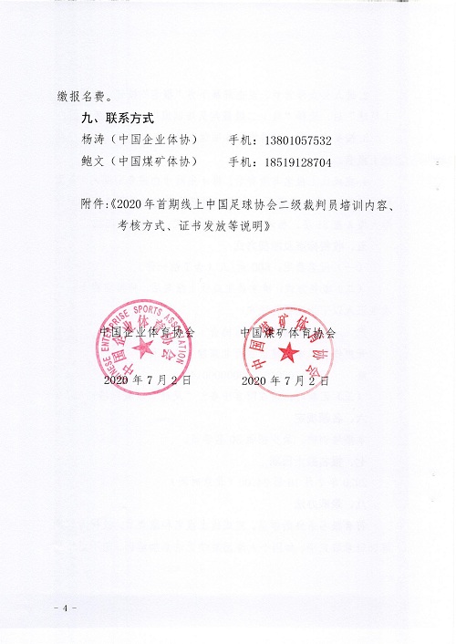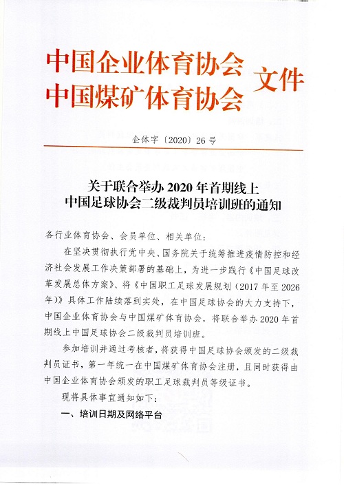 在堅決貫徹執行黨中央、國務院關于統籌推進疫情防控和經濟社會發展工作決策部署的基礎上,為進一步踐行《中國足球改革發展總體方案》、將《中國職工足球發展規劃(2017年至2026年)》具體工作陸續落到實處,在中國足球協會的大力支持下,中國企業體育協會與中國煤礦體育協會,將聯合舉辦2020年首期線上中國足球協會二級裁判員培訓班。