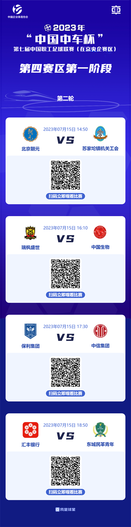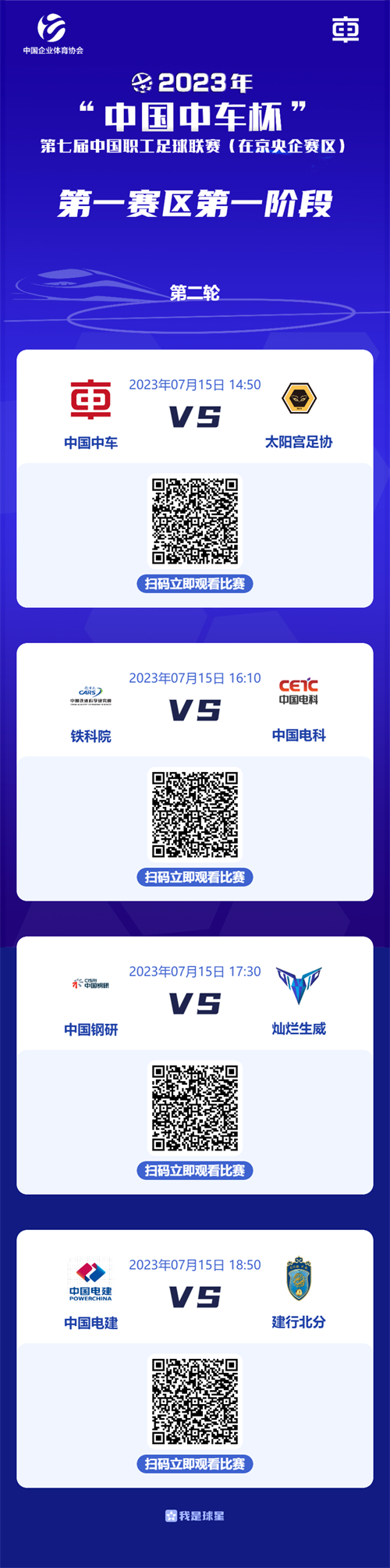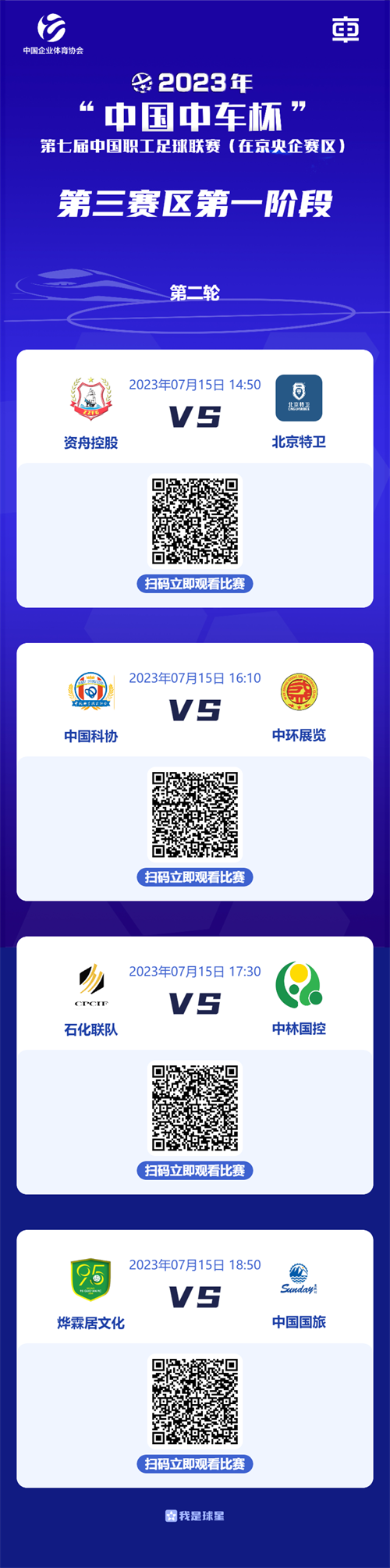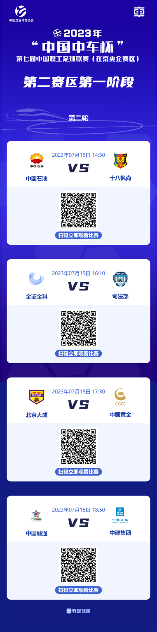2023年“中國中車杯”第七屆中國職工足球聯賽(在京央企賽區),第一階段第二輪比賽,于7月15日下午,在四個賽區同時開賽。16場比賽均網絡直播,歡迎大家收看,為職工足球愛好者喝彩!