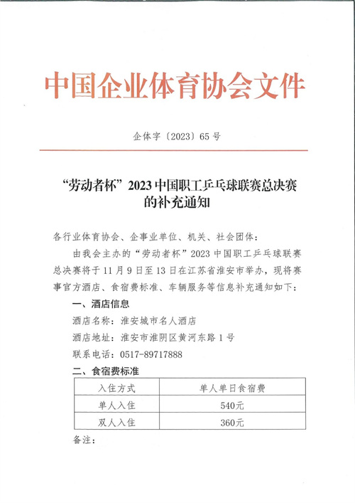 “勞動者杯”2023中國職工乒乓球聯賽總決賽的補充通知
