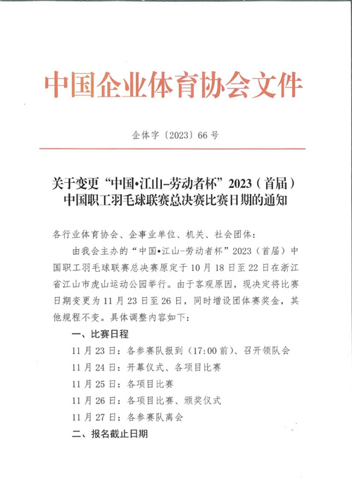 關于變更”中國·江山 - 勞動者杯“2023(首屆)中國職工羽毛球聯賽總決賽比賽日期的通知