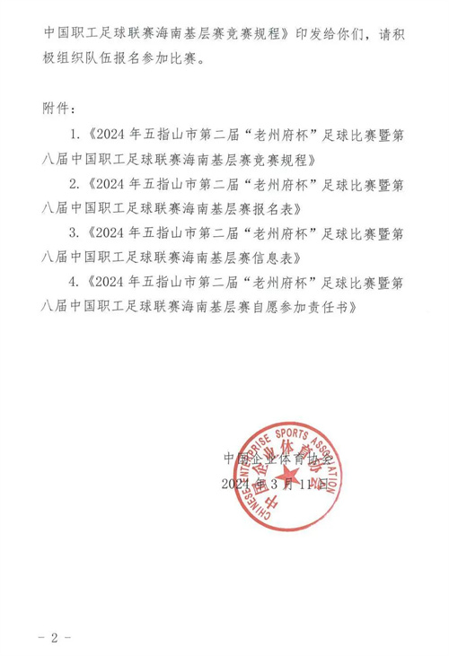 中國(guó)企業(yè)體育協(xié)會(huì)關(guān)于印發(fā)2024年五指山市第二屆“老州府杯”足球比賽暨第八屆中國(guó)職工足球聯(lián)賽海南基層賽競(jìng)賽規(guī)程的通知