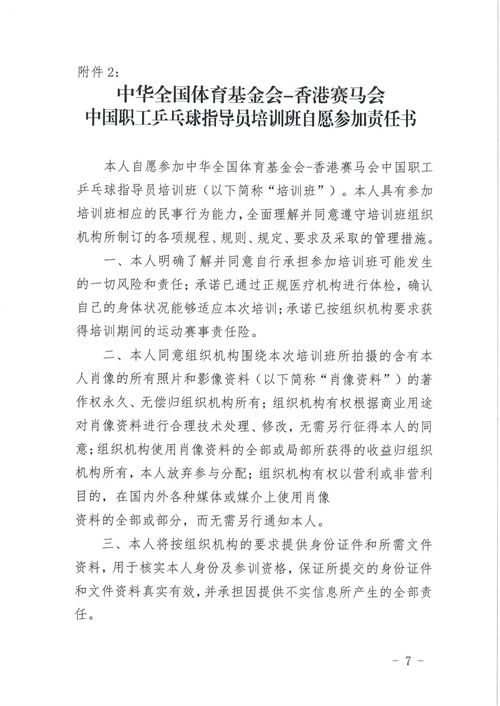 附件2:中華全國體育基金會-香港賽馬會中國職工乒乓球指導(dǎo)員培訓(xùn)班自愿參加責任書
