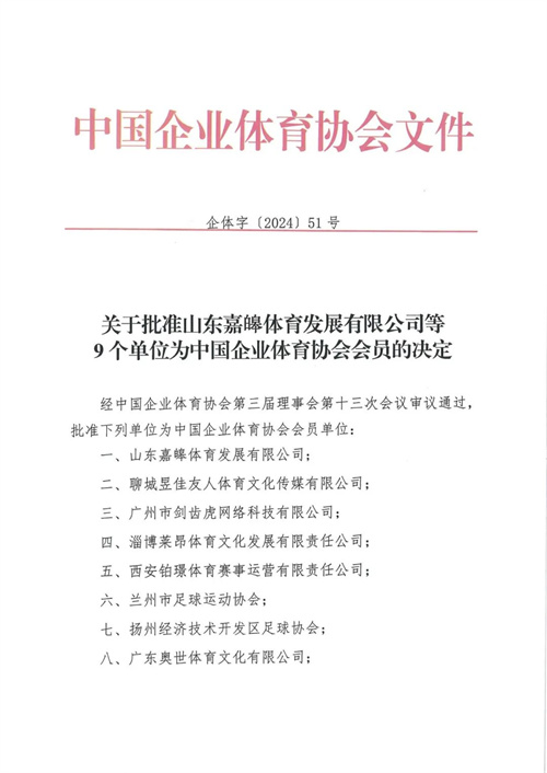 關(guān)于批準(zhǔn)山東嘉皞體育發(fā)展有限公司等9個(gè)單位為中國(guó)企業(yè)體育協(xié)會(huì)會(huì)員的決定