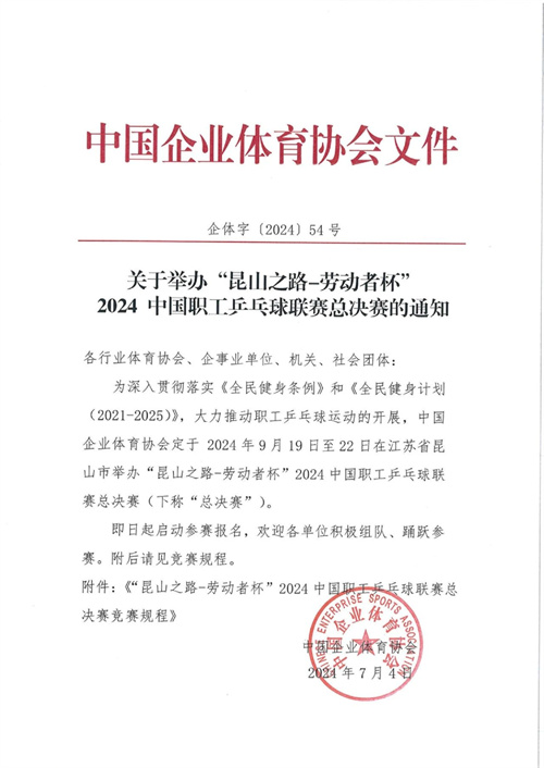 關于舉辦“昆山之路 - 勞動者杯”2024中國職工乒乓球聯賽總決賽的通知
