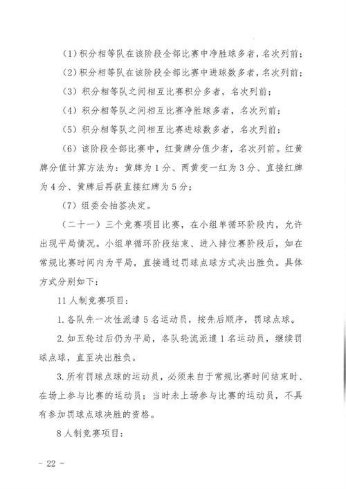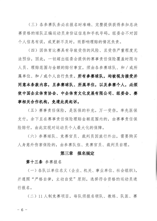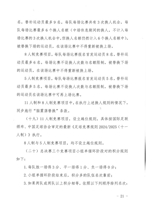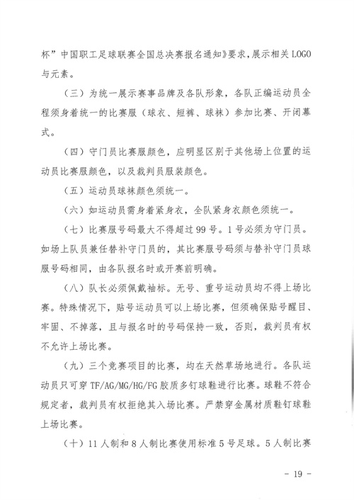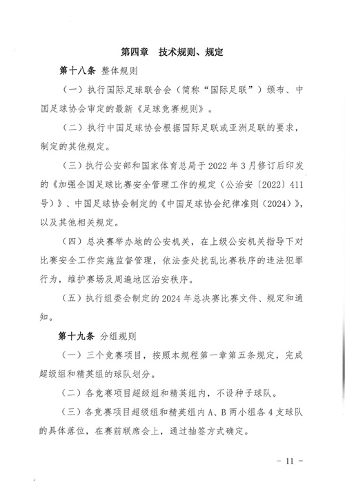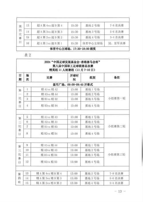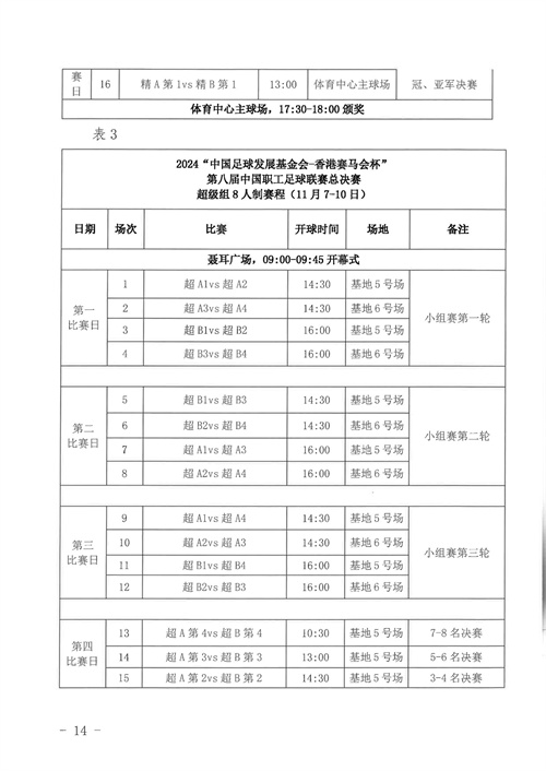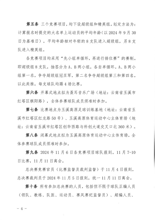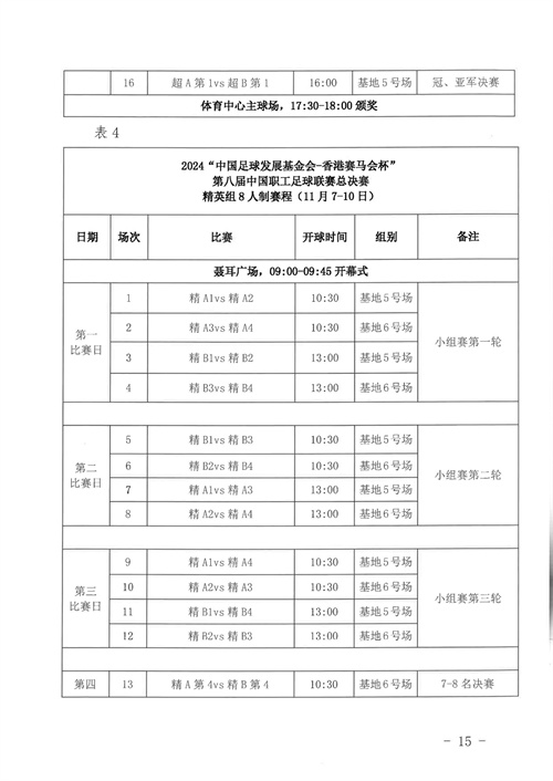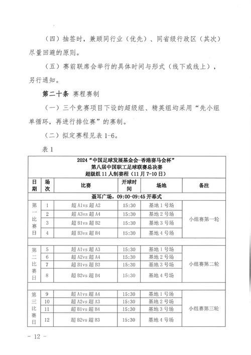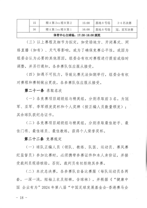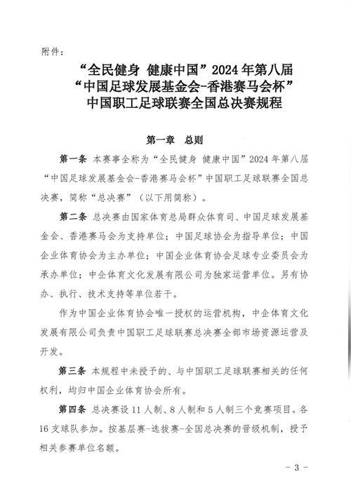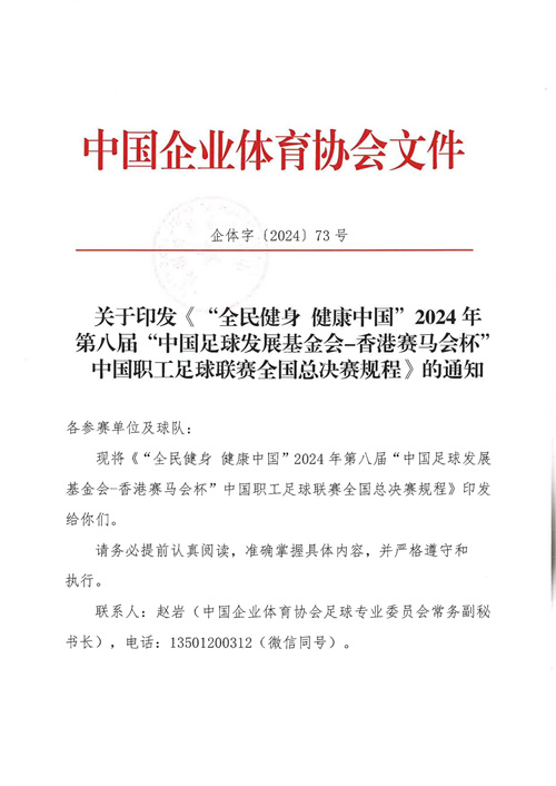 各參賽單位及球隊:“全民健身 健康中國”2024年第八屆“中國足球發(fā)展基金會-香港賽馬會杯”中國職工足球聯(lián)賽全國總決賽(以下簡稱“賽事”)定于2024年11月6日(報到)至11日(離會)在云南省玉溪市高原足球訓練基地舉行。為了更好的、從容不迫的進行賽事籌備組織工作,現(xiàn)將賽事規(guī)程印發(fā)給你們。請務必提前認真閱讀,準確掌握具體內容,并嚴格遵守和執(zhí)行。聯(lián)系人:趙巖(中國企業(yè)體育協(xié)會足球專業(yè)委員會常務副秘書長),電話:13501200312(微信同號)。