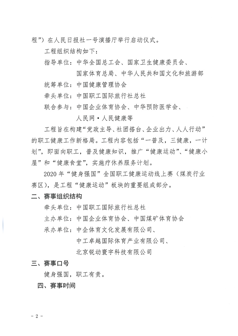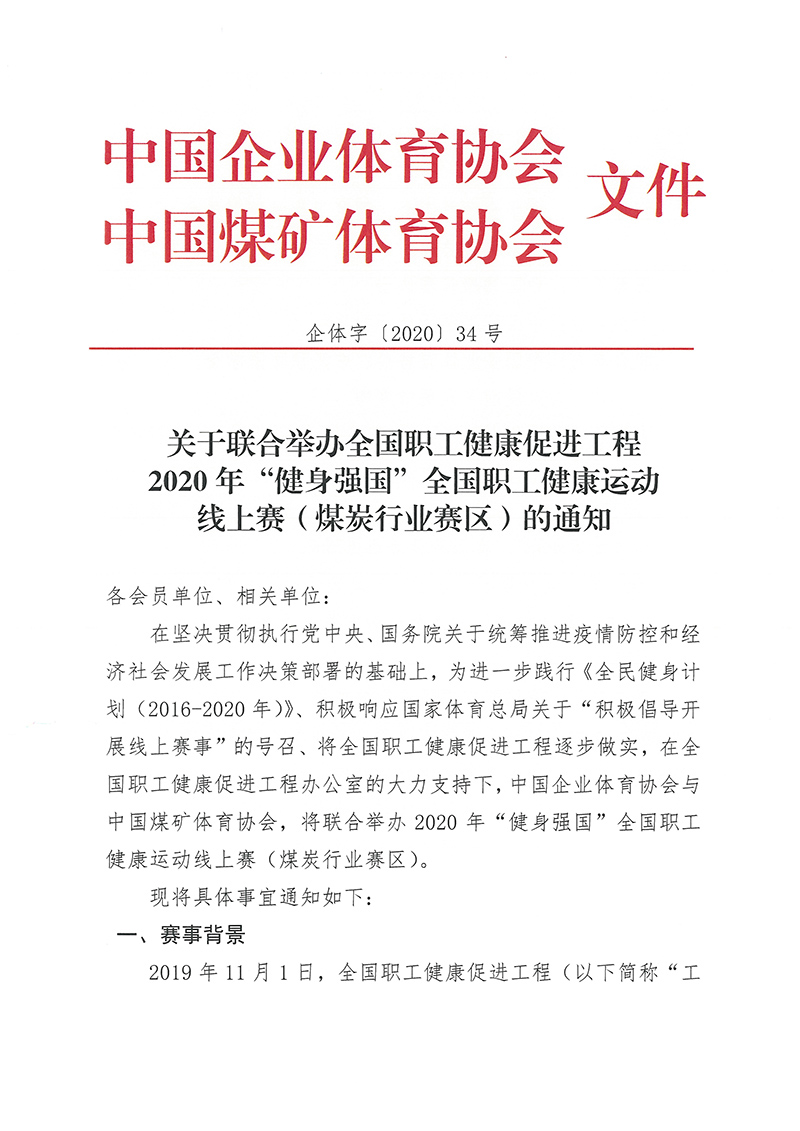 關于聯合舉辦全國職工健康促進工程2020年“健身強國”全國職工健康運動線上賽(煤炭行業賽區)的通知
