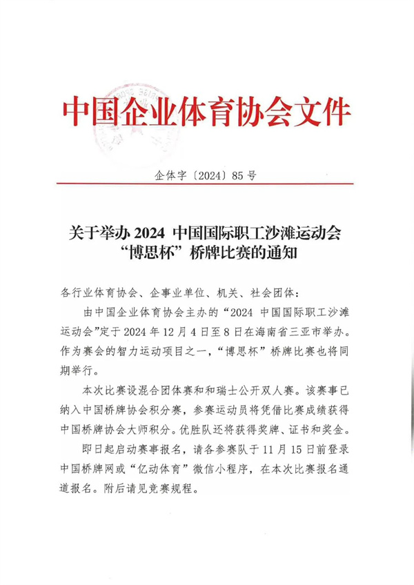 關于舉辦2024中國職工沙灘運動會“博思杯”橋牌比賽的通知