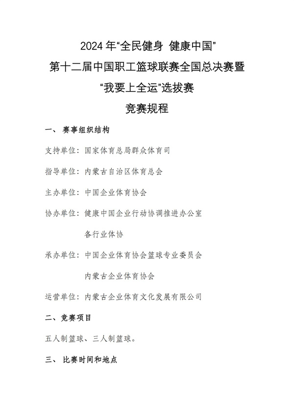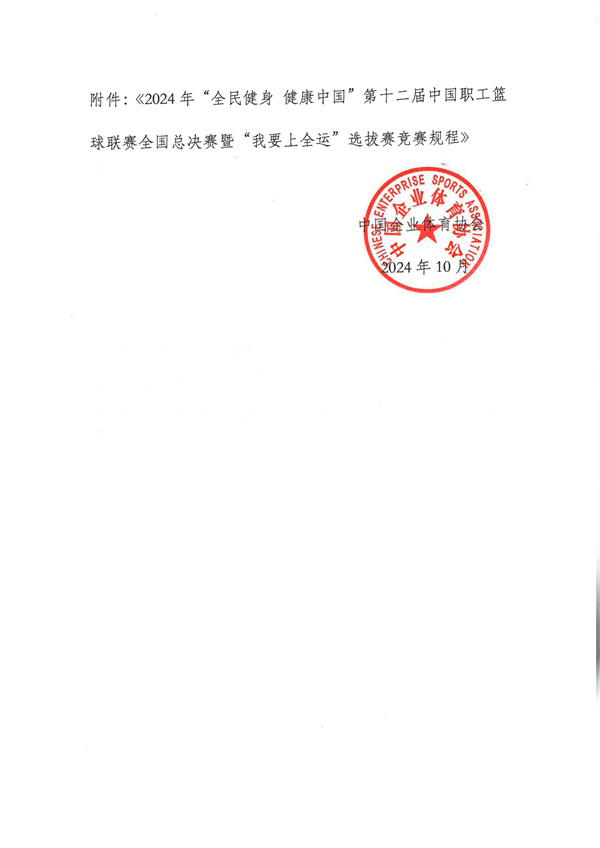 關于印發《2024年“全民健身 健康中國”第十二屆中國職工籃球聯賽全國總決賽暨“我要上全運”選拔賽競賽規程》的通知