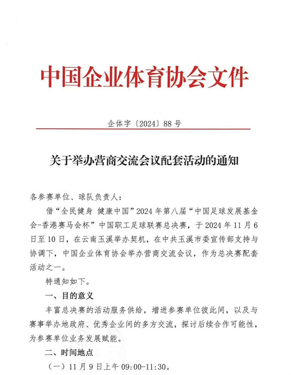 “全民健身 健康中國”2024年第八屆“中國足球發展基金會-香港賽馬會杯”中國職工足球聯賽全國總決賽(以下簡稱“總決賽”),將于11月7日上午在云南玉溪隆重開幕。圍繞總決賽展開營商交流,是本屆總決賽重要配套活動之一,營商交流會議將于11月9日上午在玉溪市中玉大酒店舉行,現通知如下: