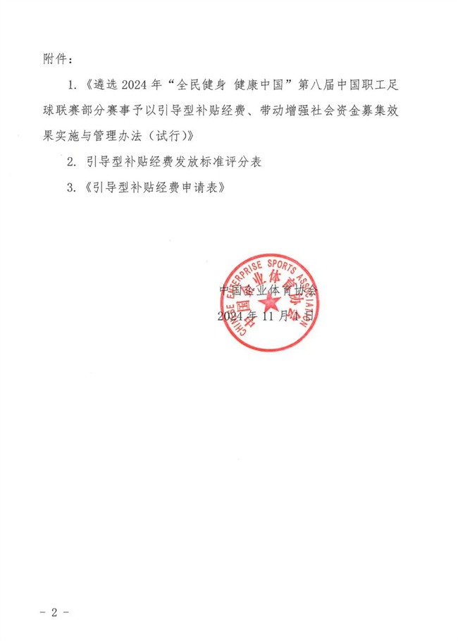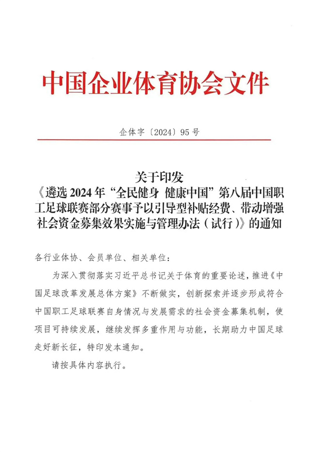 企體字〔2024〕95號關于印發《遴選2024年“全民健身 健康中國”第八屆中國職工足球聯賽部分賽事予以引導型補貼經費、帶動增強社會資金募集效果實施與管理辦法(試行)》的通知