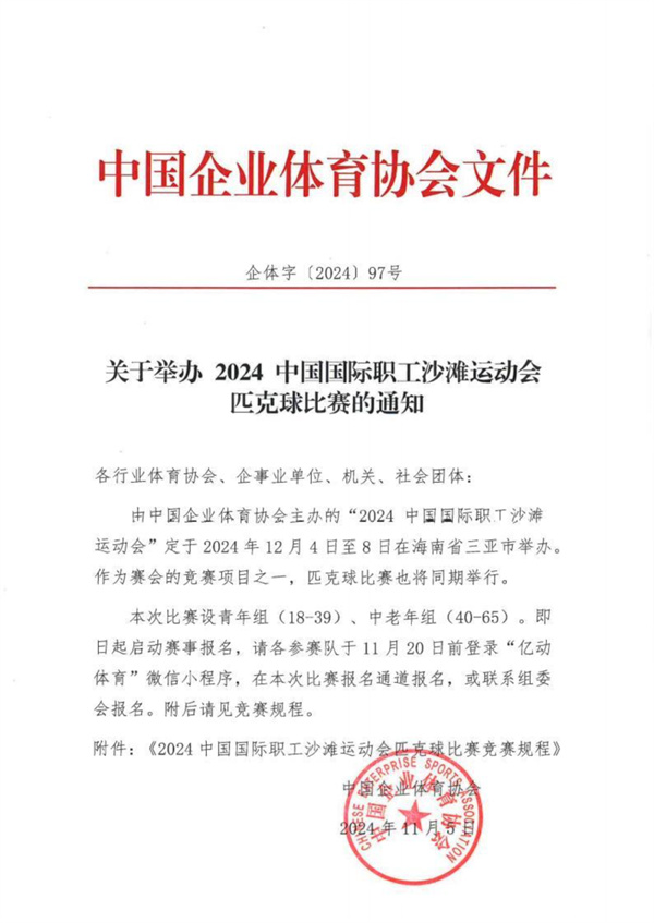 關(guān)于舉辦2024中國(guó)國(guó)際職工沙灘運(yùn)動(dòng)會(huì)匹克球比賽的通知