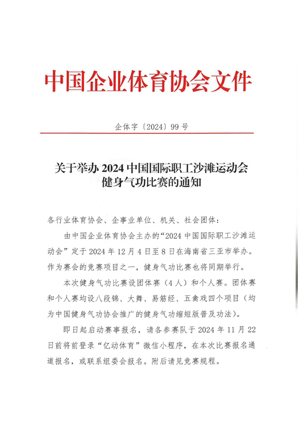關于舉辦2024中國國際職工沙灘運動會健身氣功比賽的通知