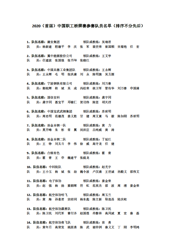 2020(首屆)中國職工橋牌錦標(biāo)賽報(bào)名情況公示