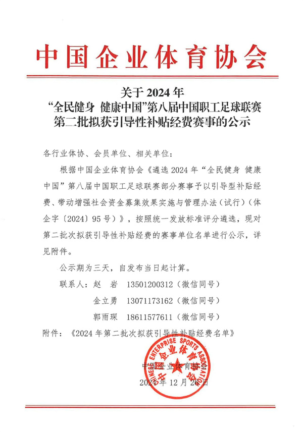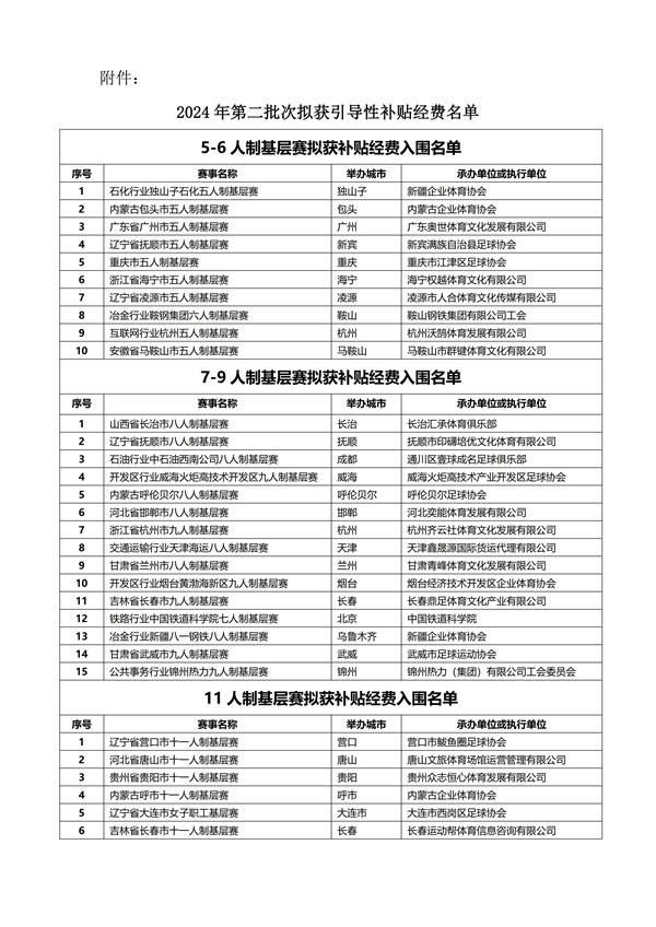 關于2024年“全民健身 健康中國”第八屆中國職工足球聯賽第二批擬獲引導性補貼經費賽事的公示