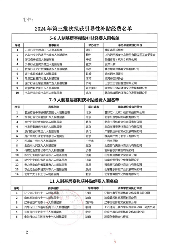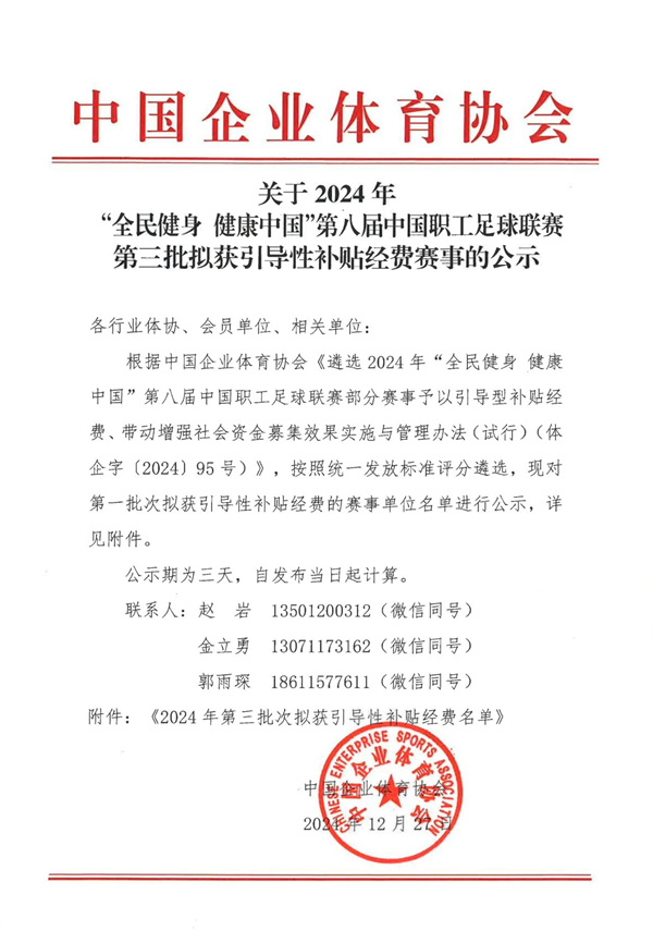 關(guān)于2024年“全民健身 健康中國”第八屆中國職工足球聯(lián)賽第三批擬獲引導(dǎo)性補貼經(jīng)費賽事的公示