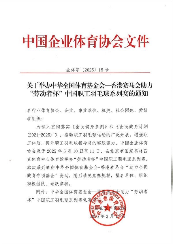 關(guān)于舉辦中華全國(guó)體育基金會(huì)-香港賽馬會(huì)助力“勞動(dòng)者杯”中國(guó)職工羽毛球系列賽的通知