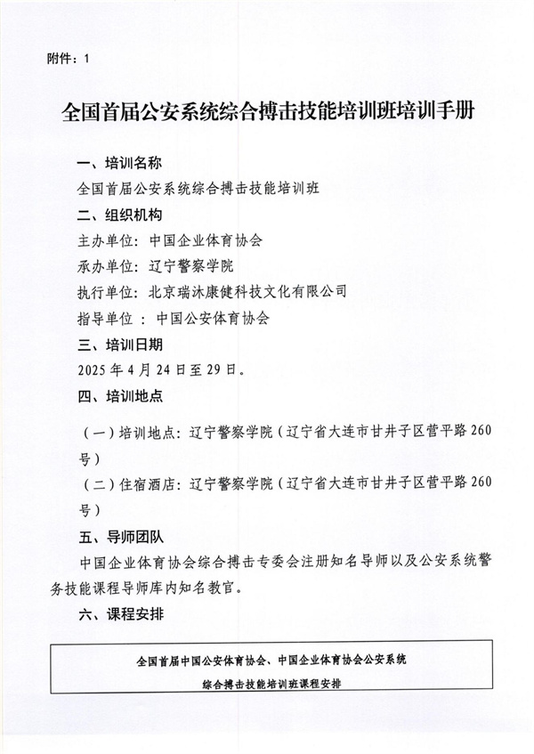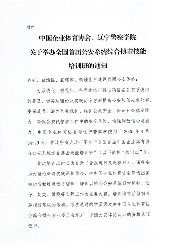 1、中國企業體育協會、遼寧警察學院關于舉辦全國首屆公安系統綜合搏擊技能培訓班的通知