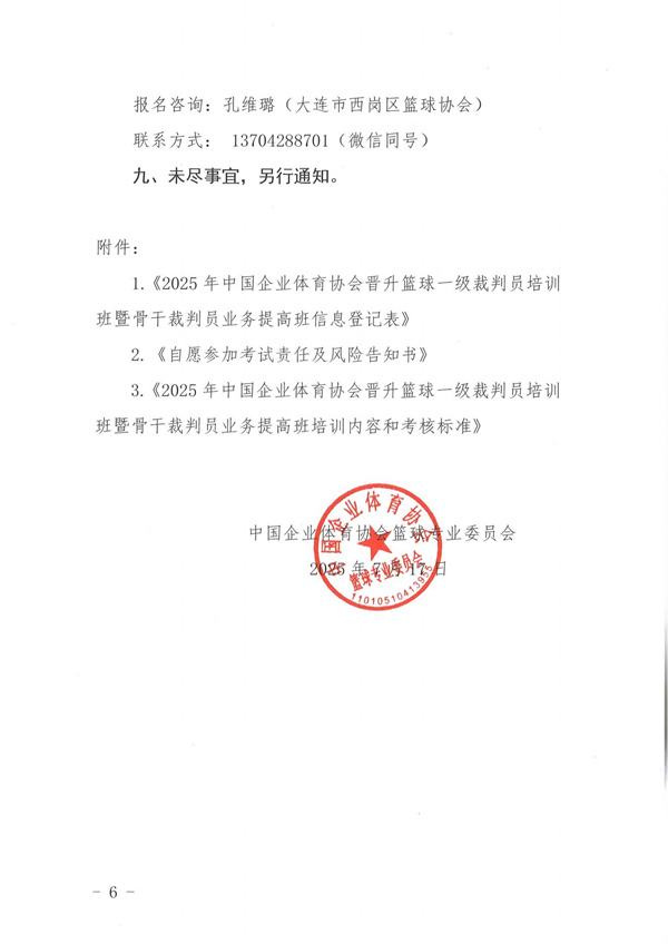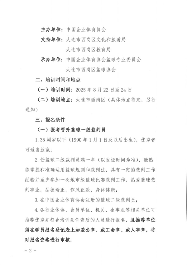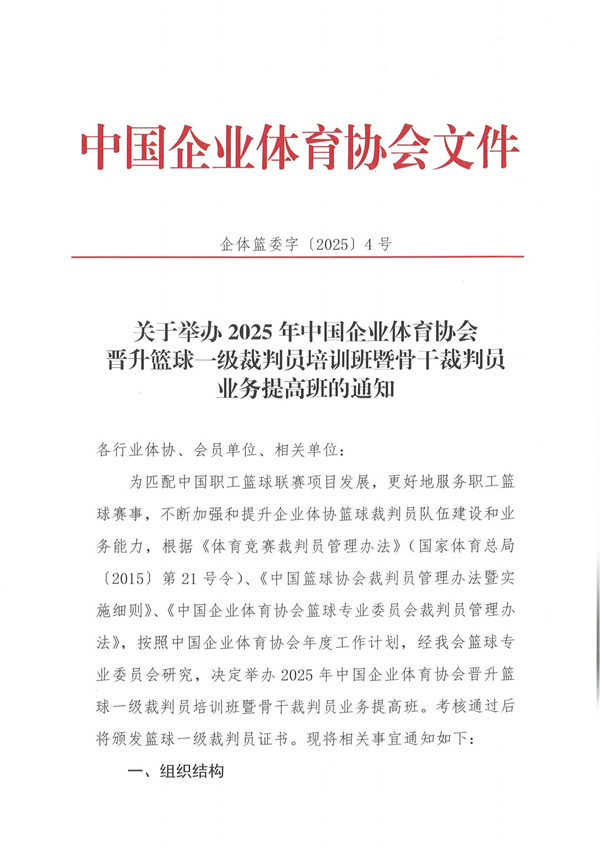 1、關于舉辦2025年中國企業體育協會晉升籃球一級裁判員培訓班暨骨干裁判員業務提高班的通知