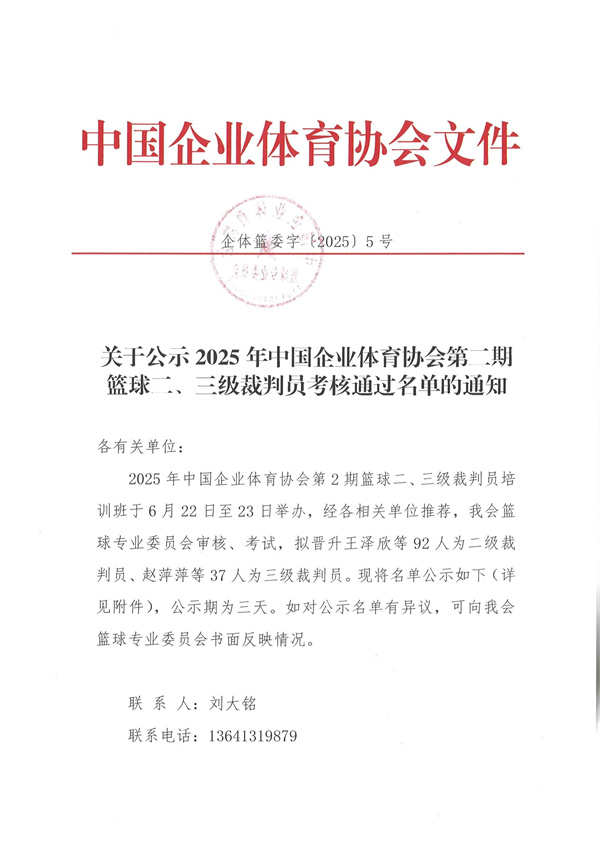 2025年中國企業體育協會第2期籃球二、三級裁判員培訓班于6月22日至23日舉辦,經各相關單位推薦,我會籃球專業委員會審核、考試,擬晉升王澤欣等92人為二級裁判員、趙萍萍等37人為三級裁判員。現將名單公示如下(詳見附件),公示期為三天。如對公示名單有異議,可向我會籃球專業委員會書面反映情況。